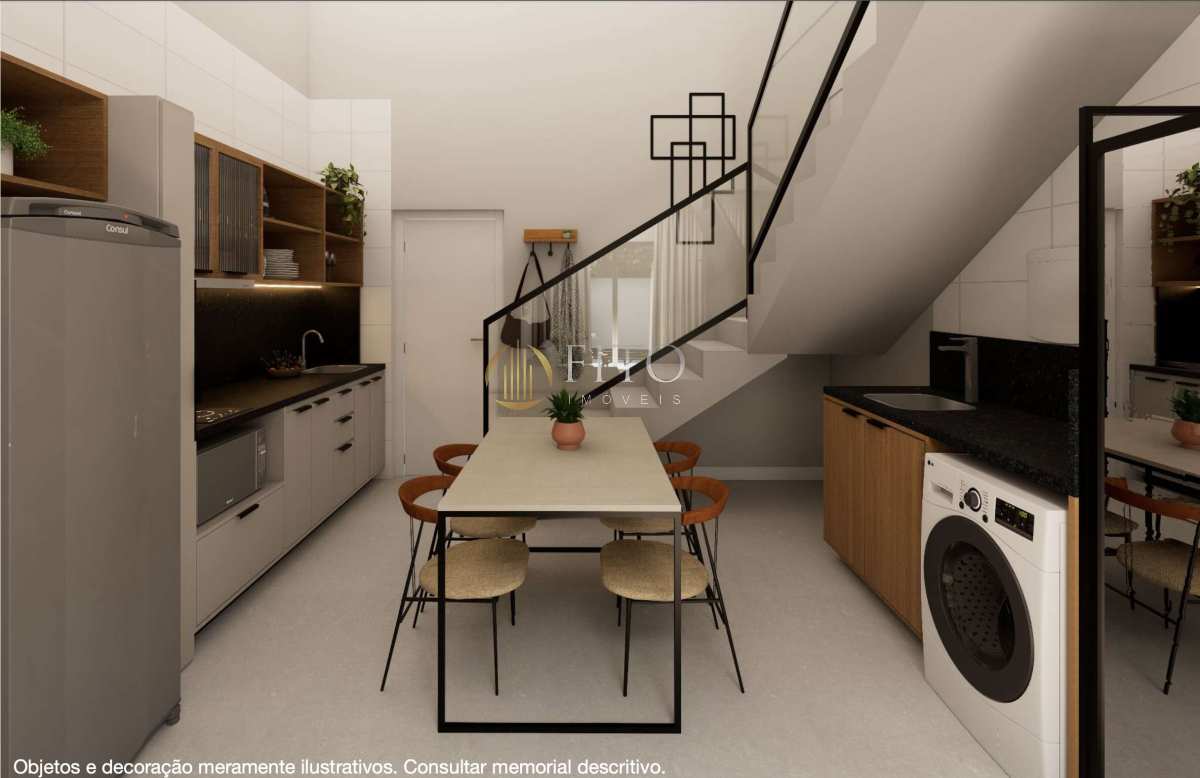Térreo: cozinha equipada com eletrodomésticos, sala de jantar integrada, estar aconchegante e lavabo.